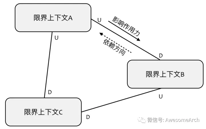 两个限界上下文之间的关系是有方向的,领域驱动设计使用两个专门的术语来表述它们:“上游(Upstream)”和“下游(Downstream)”,在上下文映射图中,以 U 代表上游,D 代表下游,理解它们之间的关系,正如理解该术语隐喻的河流,自然是上游产生的变化会影响到下游,反之则不然。故而从上游到下游的关系方向,代表了影响产生的作用力,影响作用力的方向与程序员惯常理解的依赖方向恰恰相反,上游影响了下游,意味着下游依赖于上游。