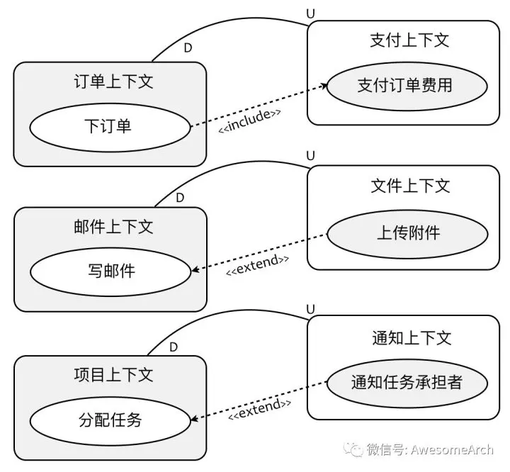 在划分限界上下文的业务边界时,我们常常从“语义相关性”与“功能相关性”两个角度去判别职责划分的合理性。在上下文映射中,我发现之所以两个业务边界的限界上下文能产生上下游协作关系,皆源于二者的功能相关性,这种功能相关存在主次之分,往往是上游限界上下文作为下游限界上下文的功能支撑,这就意味着在当前的协作关系下,下游限界上下文中的用例才是核心领域。例如,订单与支付,下订单用例才是核心功能,支付功能作为支撑的公开服务而被调用;例如,邮件与文件共享,写邮件用例才是核心功能,上传附件作为支撑的公开服务而被调用;例如,项目管理与通知,分配任务用例才是核心功能,通知功能作为支撑的公开服务而被调用。巧的是,这种主次功能的调用关系,几乎对应的就是用例图中的包含用例或扩展用例。