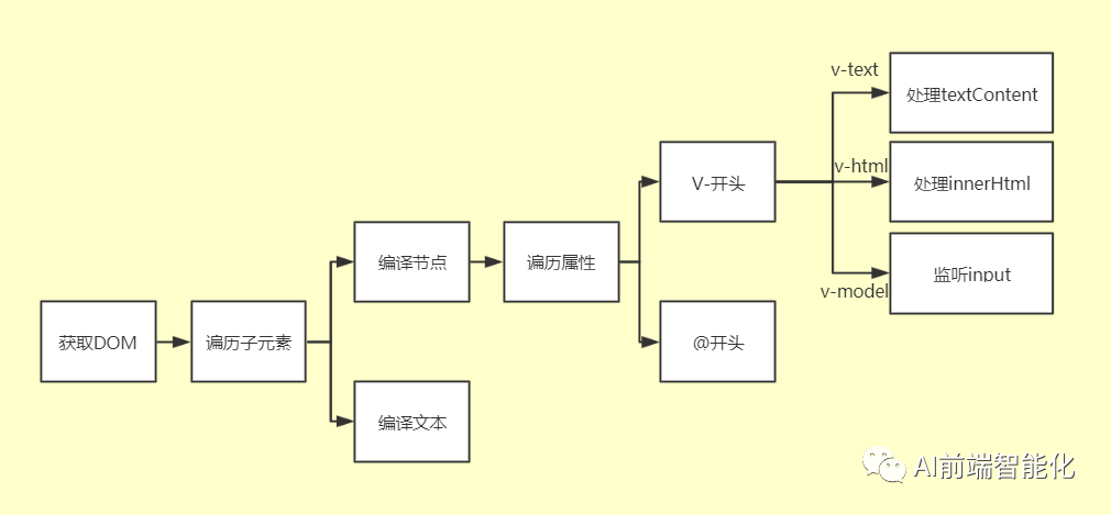 获取dom,遍历dom,获取{{}}、v-和@开头的 ,设置响应式
