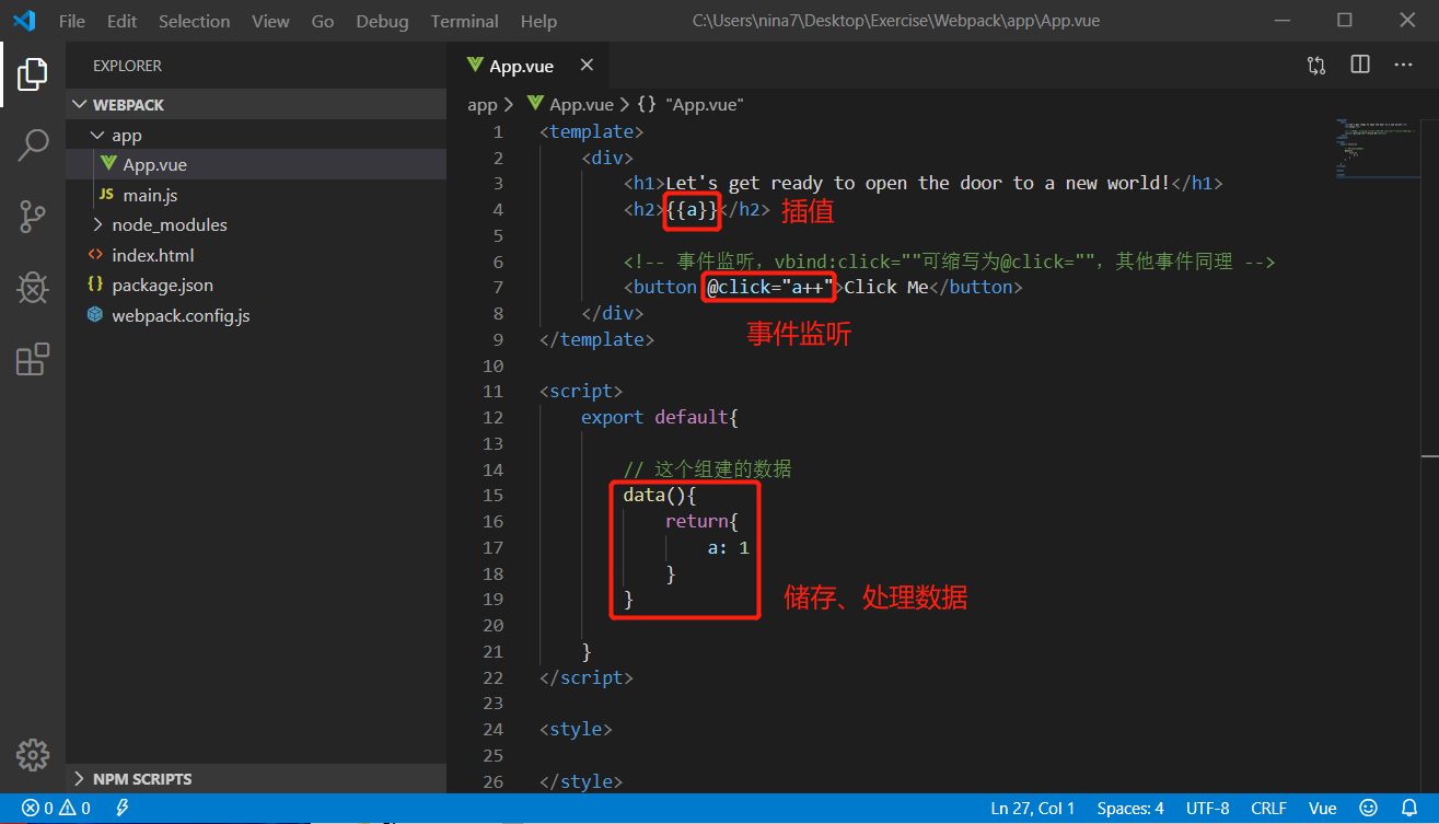 ① data - 一个函数,用于储存并处理组件的数据,返回一个对象,data返回的这个对象中可以写入任意属性,这些数据可以被{{}}插入到template中加以运用,data中没有的数据不能进行插值,否则程序报错;