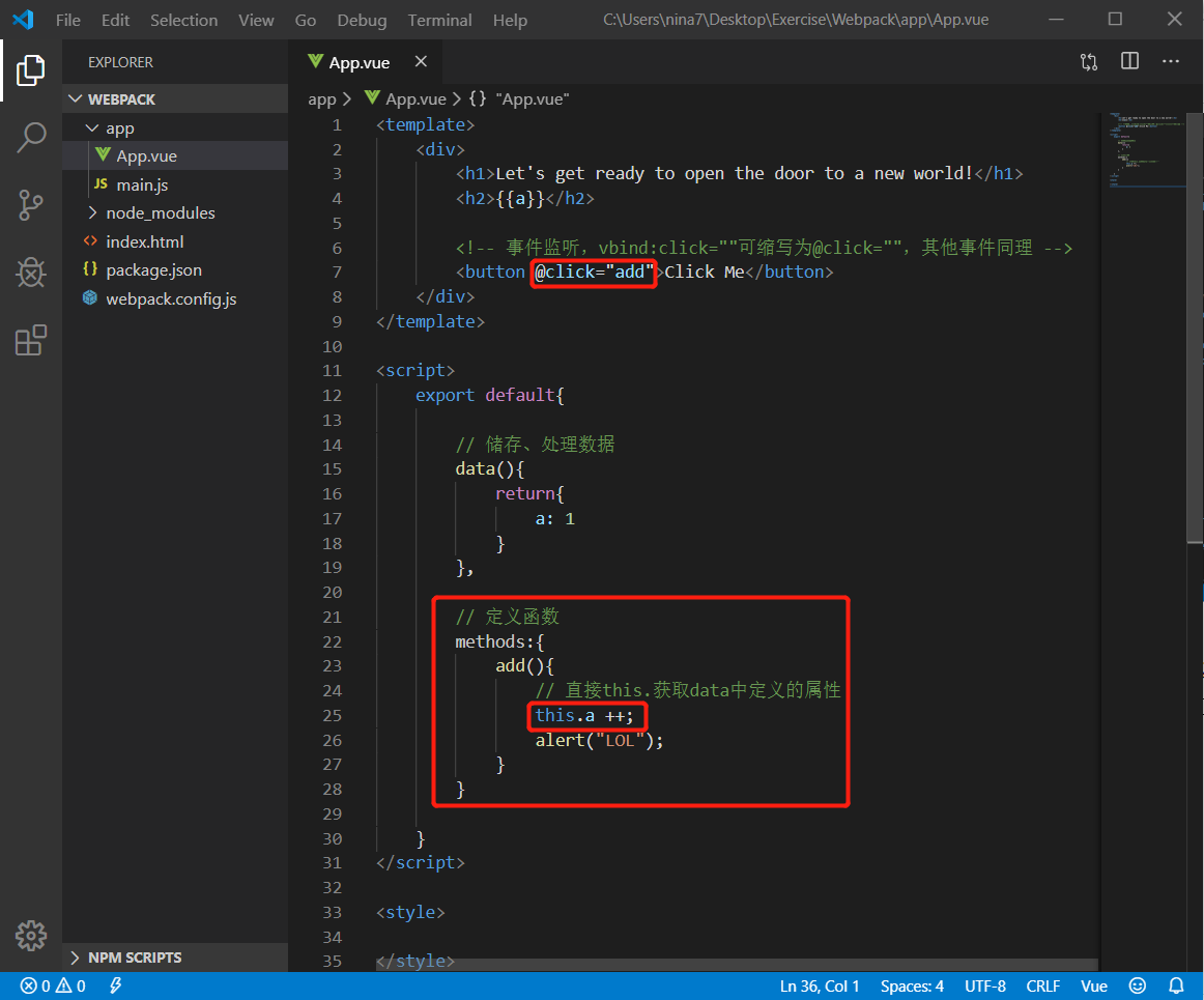 ② methods - 一个对象,用于存放函数,一般是存放v-on事件绑定的事件函数,在data中定义的属性会成为本组件的属性也就是该属性已经挂靠在Vue的实例上,这些属性可以在methods定义的函数中直接this.获取,这里的this指向Vue的实例;
