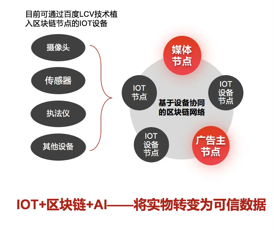 众所周知,区块链擅长解决上链数据防篡改,却难以保证上链前数据的真实性。百度超级链独创的轻量级节点(LCV)将区块链与物联网结合,提出了可信的区块链数据采集方式,安装了集成轻量级节点(LCV)的SDK后,线下广告屏幕就成为了智能化的区块链节点,所有播放数据上链可查,保证数据的真实性和不可篡改性,降低了区块链接入成本。在安全性上,保证在可信环境里采集数据,并多中心化记录。