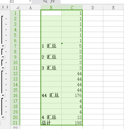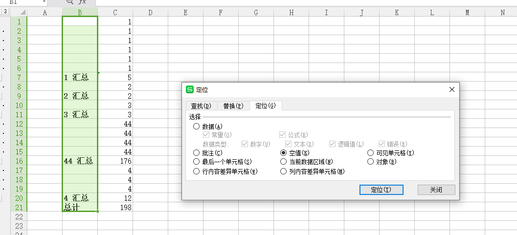 Excel批量合并相同的单元格 就是我 2020-01-20 562 阅读1分钟 以下是需要合并的数据(建议合并完之后,再加列名) 合并完成之后是这样的 1、选中列B,选择选项卡数据,选择分类汇总 2、点击确定之后(原先的列B成了列C) 3、选择列B,按住Ctrl+g,选择空值,点击定位 4、点击定位之后,选择开始选项卡,点击合并居中 5、选择列C,选择数据选项卡,点击分类汇总,点击全部删除 6、点击全部删除之后 7、选择列B,选择开始选项卡,点击格式刷,选择列C,然后删除列B,就完成辣!