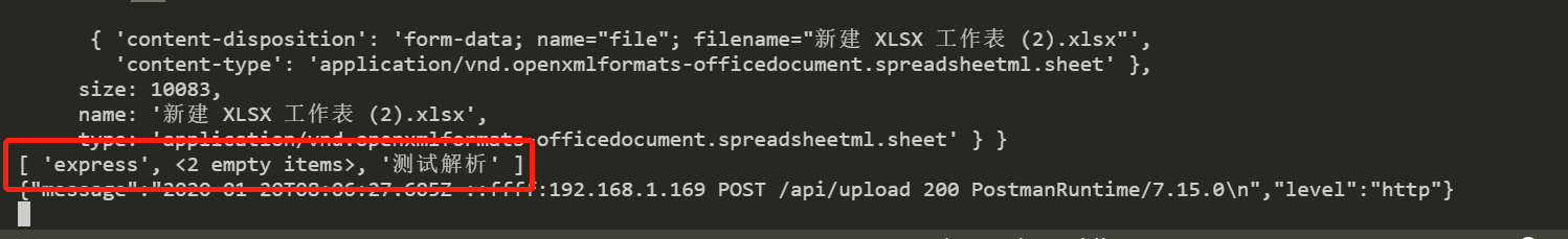 app.post("/upload",checkToken,multipartMiddleware,user.getFileData);我们新建一个excel,