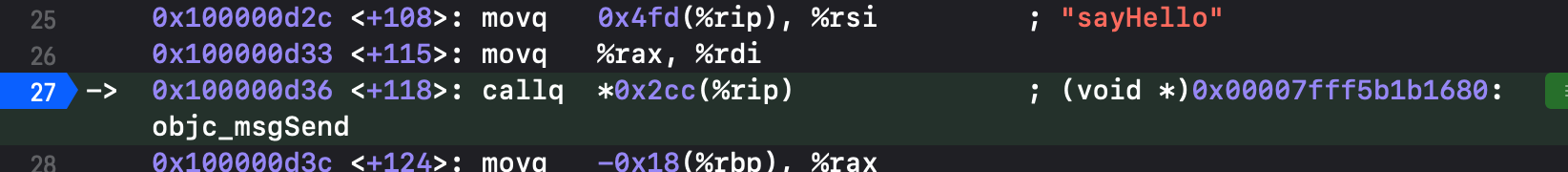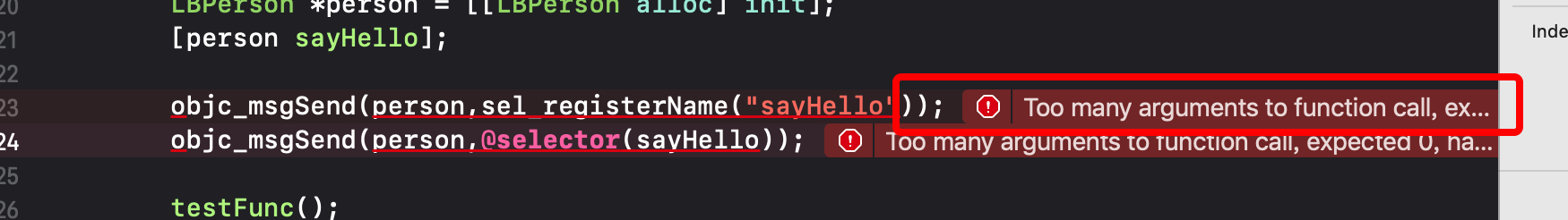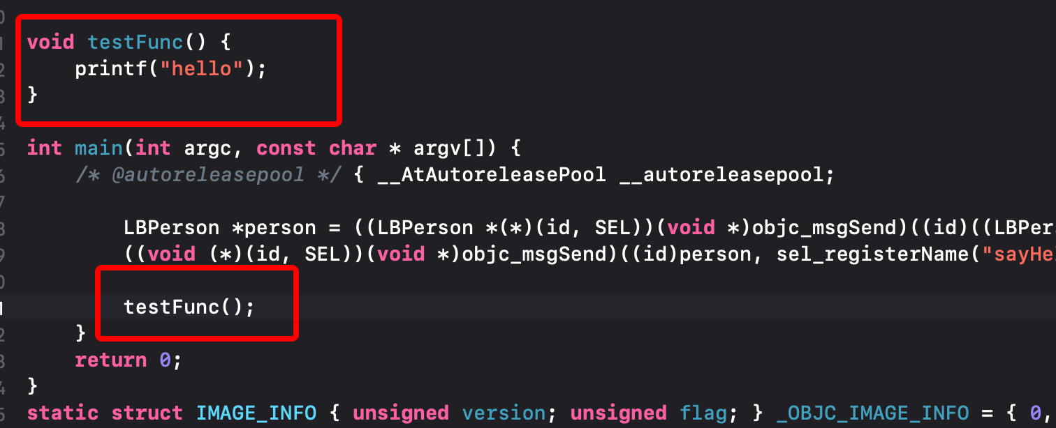 objc_msgSend函数,我们可以联想到方法里面有两个默认的参数,一个是id self,还有一个是sel _cmd。这里应该就呼应上了,大概就清楚是怎么调用方法的了。那么objc_msg 到底做了什么呢?还有一个问题函数的调用本地是什么样子的呢?我们修改步骤1 的代码如下:void testFunc() { printf("hello"); } int main(int argc, const char * argv[]) { @autoreleasepool { // insert code here... LBPerson *person = [[LBPerson alloc] init]; [person sayHello]; testFunc(); } return 0; }接着 我们继续clang一下: