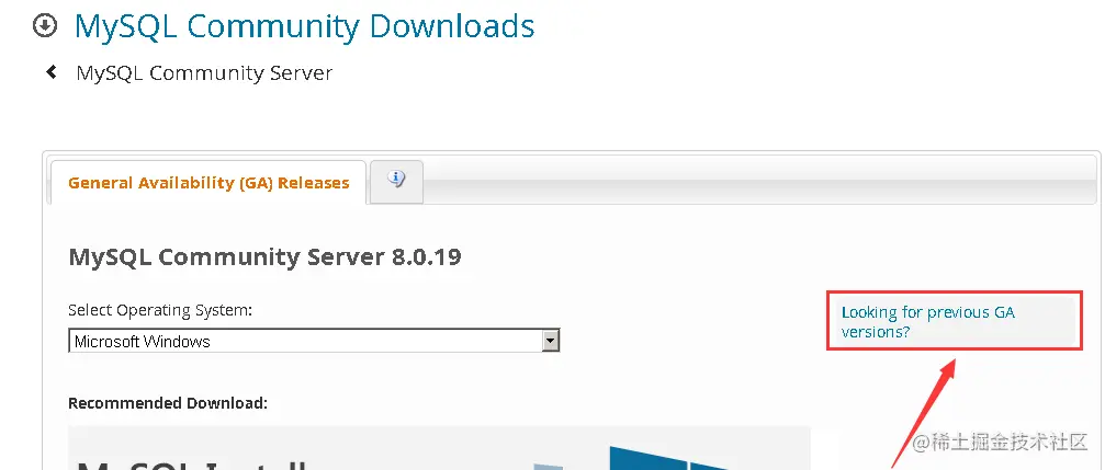 1、选择 Looking for previous GA versions?界面默认是mysql8.0版本的我们需要手动切换到5.x版本下载界面