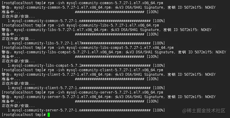 [root@localhost tmp]# rpm -ivh mysql-community-common-5.7.27-1.el7.x86_64.rpm