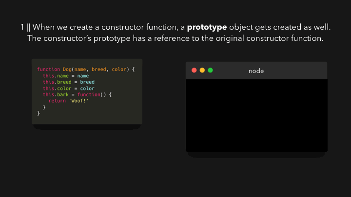 创建Dog构造函数时,它不是我们创建的唯一对象。我们还自动创建了另一个对象,称为原型(prototype)!默认情况下,此对象包含一个构造函数(constructor),该属性只是对原始构造函数的引用,在本例中是Dog。