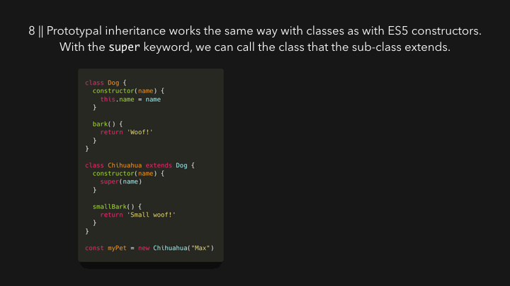 现在,我们一直在使用构造函数(function Dog() { ... }),它仍然是有效的JavaScript。但是,ES6实际上为构造函数和原型使用了一种更简单的语法:类!