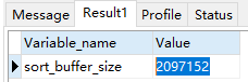 可用命令查看Mysql的sort_buffer_size大小:show GLOBAL VARIABLES like 'sort_buffer_size',默认2M,如图3.4