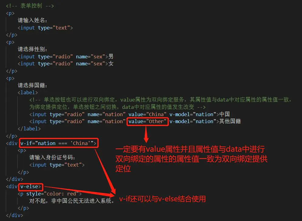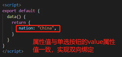 单选按钮的双向绑定必须要有一个value值与绑定属性的属性值一致来作为绑定的接口,v-model的值会有一个秘密检查,检查被绑定对象的value与自己是否匹配: