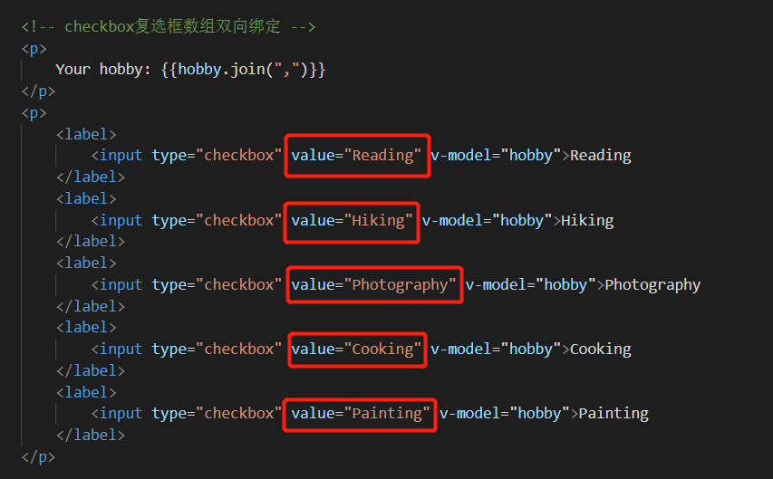 给绑定对象添加value值后,复选框可以与数组进行双向绑定