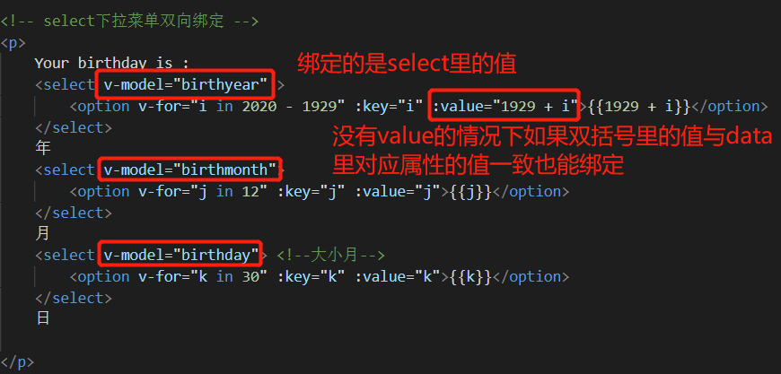【注意】"i in 2020 - 1929"是从1开始循环,因此循环第一次的value值为1930,与之匹配,data中的birthyear的值也应为1930。双向绑定属性一定要找到与之属性值匹配的值才能成功绑定。