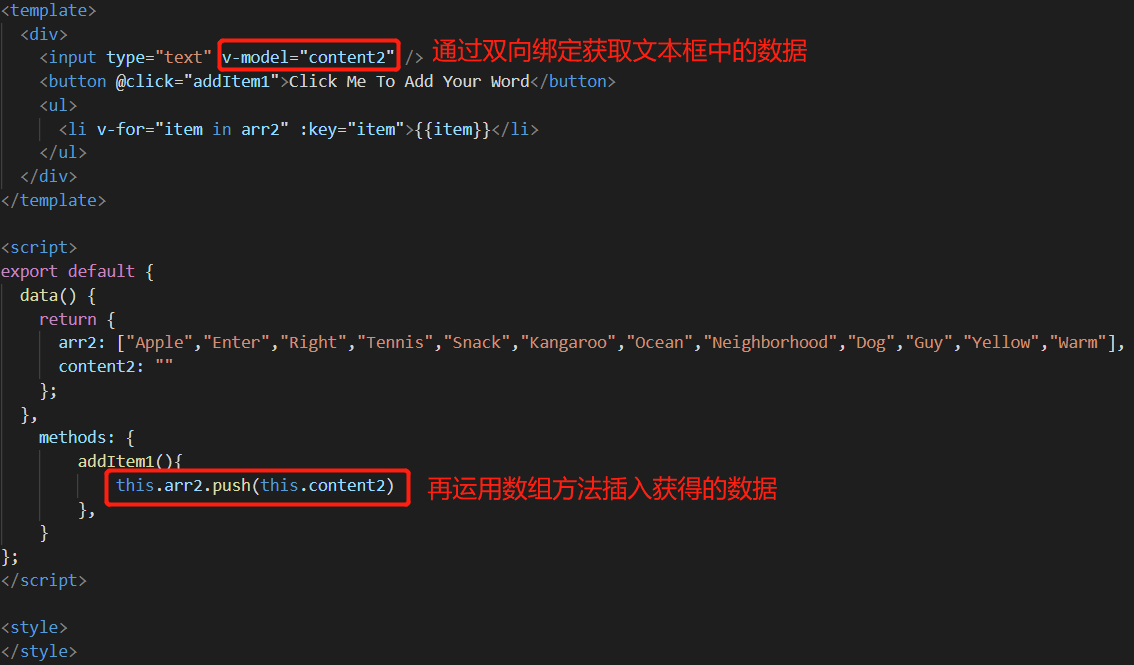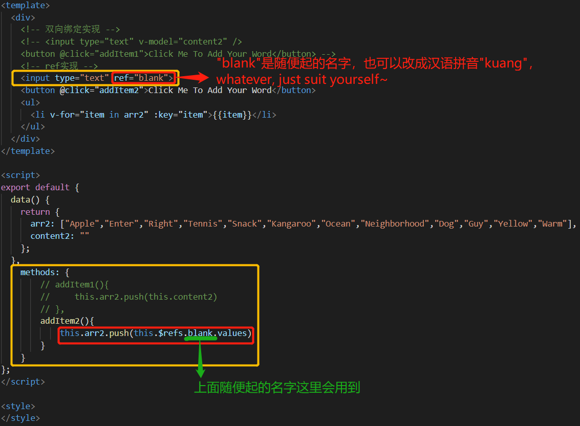 如果单纯只是想获取一个文本框中的值,不需要双向绑定,可以通过ref属性实现。