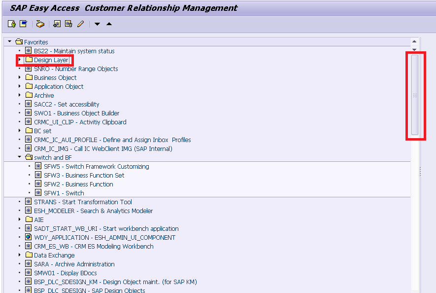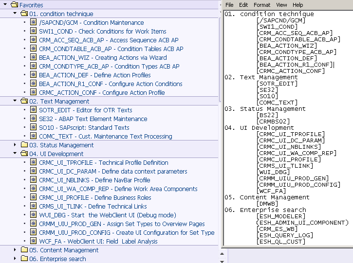 SAP Netweaver里有很多名字比较长的事务码,比如SAP CRM UI开发工具BSP_WD_CMPWB,直到今天我也记不住它。幸好SAP贴心地在SAP GUI里提供了收藏夹功能,我们可以在SAP GUI里创建树状结构的收藏夹事务码列表,可以把若干业务上相关的事务码放在同一个文件夹内,文件夹支持嵌套,如下图:
