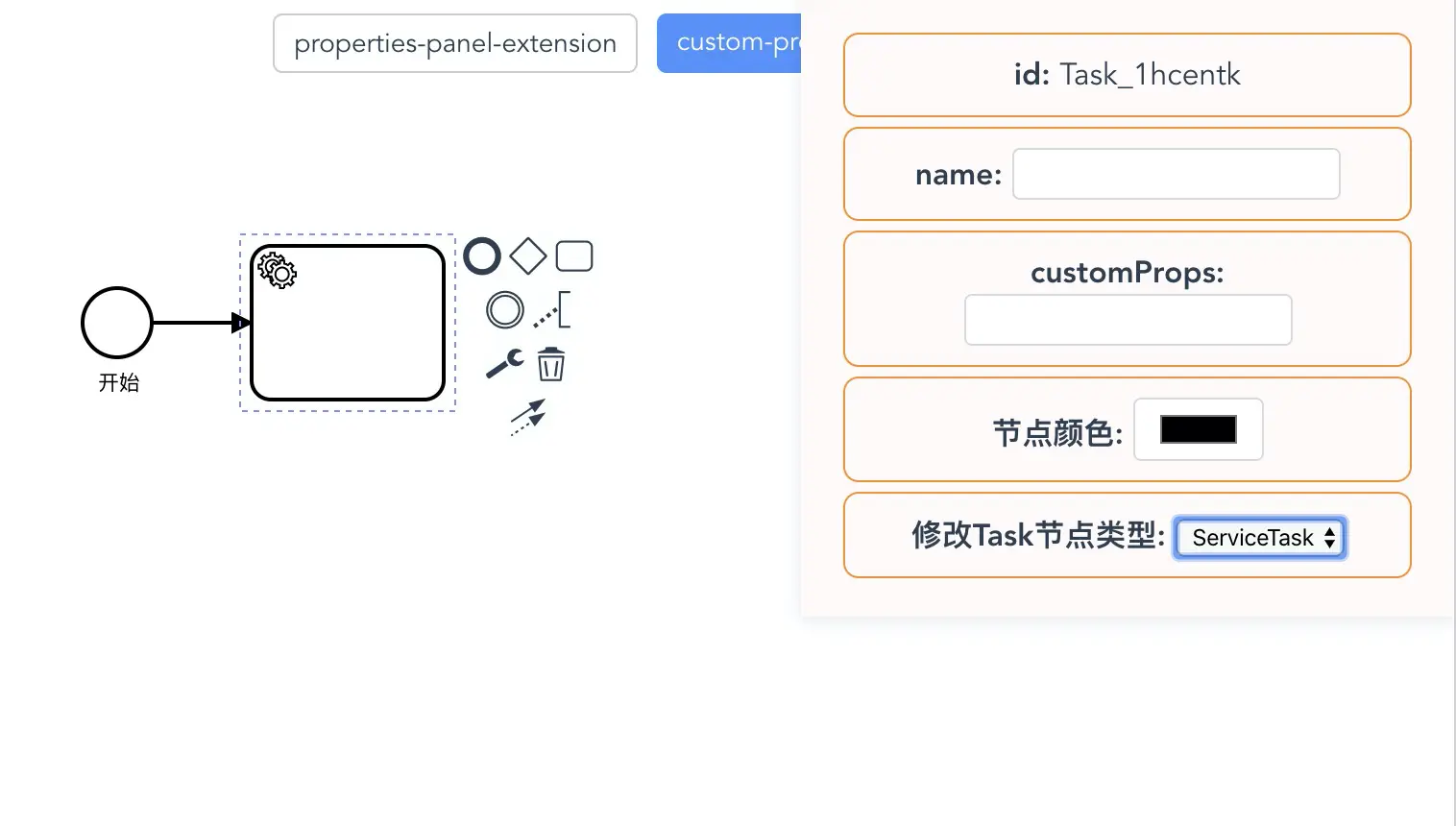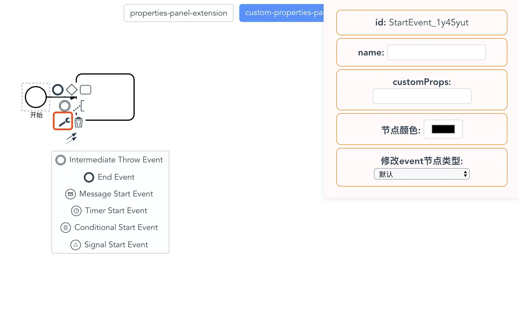 有些时候, 我们可能还需要在自定义属性栏中修改这个节点的类型, 比如在开始节点, 点击contextPad上的小扳手: