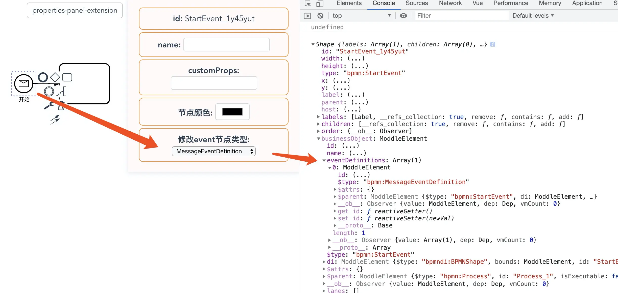 我们在设置自己的自定义属性栏的时候, 可能要根据不同的节点类型来做不同的业务逻辑判断, 并对properties-panel做一些默认值的设置, 比如上面👆的修改event类型, 这时候我们可以怎么样做呢 🤔️?