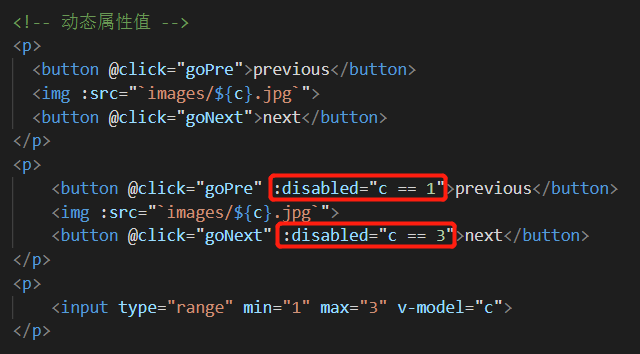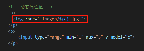 Vue - 实践案例(三)动态属性值 乌龙白桃Nina酱 2020-01-20 834 阅读1分钟 当需要html中的属性的值是动态的的时候可以在属性前加冒号。 加冒号后 "" 中就形成了一个动态的空间,因此我们要再写 `` 把属性值的字符串部分还原。 所有属性之前都可以加冒号,如此该属性的值便可以写表达式。 例如下面有三张以数字命名的图片,我们在页面中插入一张并让其随c的值的改变而改变: html: JS: 得到的效果是拖拽拖拽条可以切换图片: 写轮播图也非常方便: html: JS: 效果:
