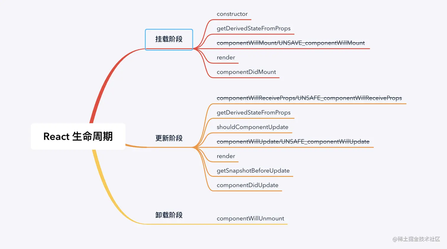 下面从三个阶段(挂载、更新、卸载)梳理下生命周期方法。