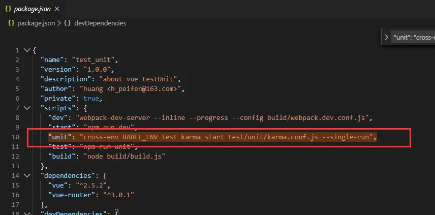 原来的是cross-env BABEL_ENV=test karma start test/unit/karma.conf.js --single-run --single-run是关于跨域的,我们只需要复制test karma start test/unit/karma.conf.js就可以了