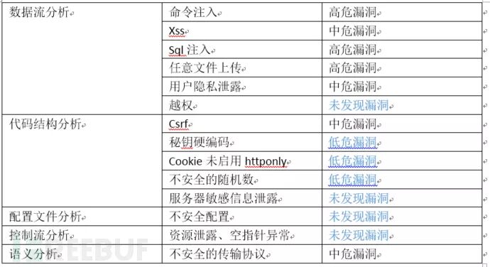 本次审计经过语义分析、数据流分析、代码结构分析、配置文件分析和控制流分析,共审计14类常见安全漏洞,发现存在10类漏洞,另外4类漏洞确认不存在,汇总信息如下: