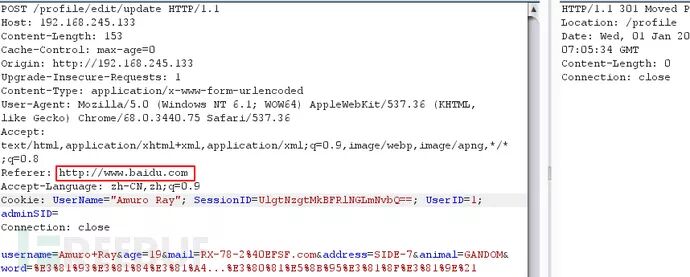 而在另一个更新用户个人信息的方法里却忽视了对referer的校验,可以确认存在csrf漏洞。