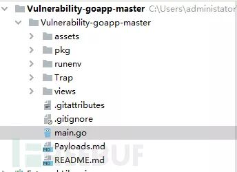 经过在github上查找,发现https://github.com/Snow-HardWolf/Vulnerability-goapp这个项目适合入门,涵盖了常见的go web安全漏洞。Gitclone之后在goland IDE里打开看到如下项目结构: