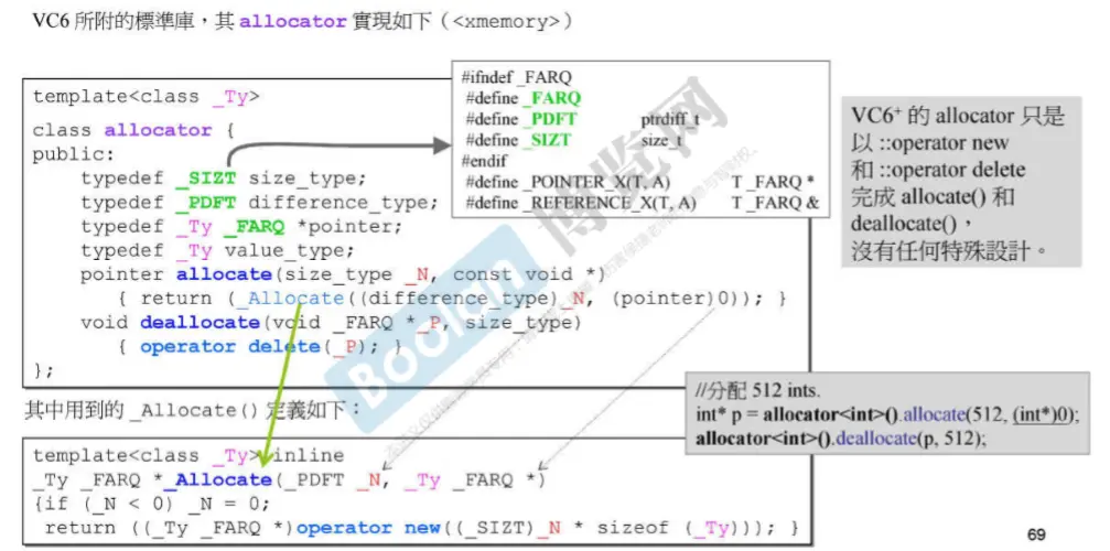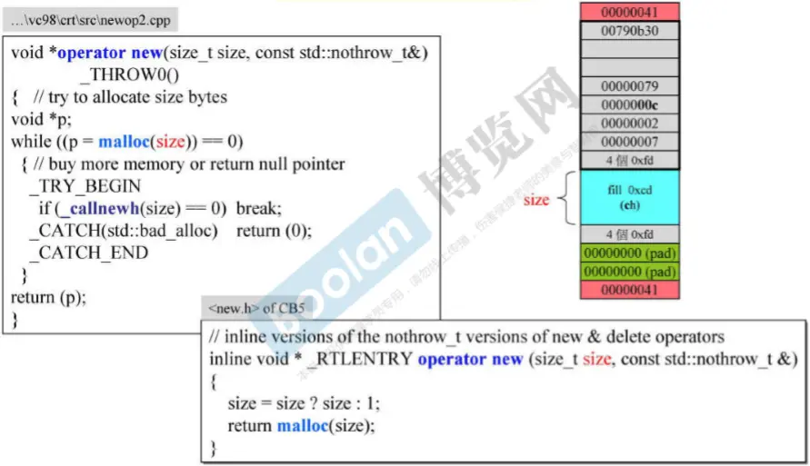 operator new()和malloc():operator new()函数最终调用都会到malloc()上,vc的分配器没有什么独特设计,它就是调用c的malloc()和free()来分配,它的接口设计使得我们并不好直接用,但容器使用就比较好。