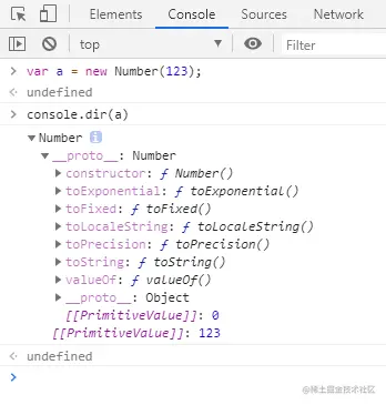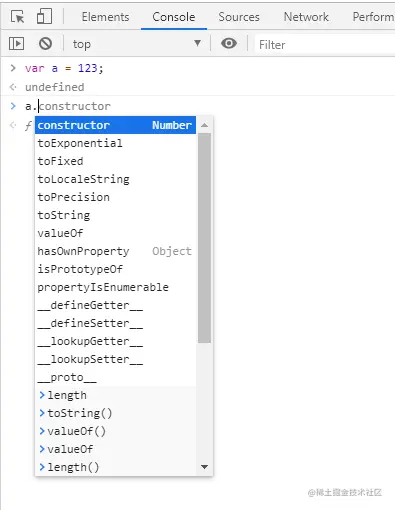 你会发现,当在控制台var了一个a,并赋予原始值123后, a.的时候会出现好多好多方法或属性的提示。