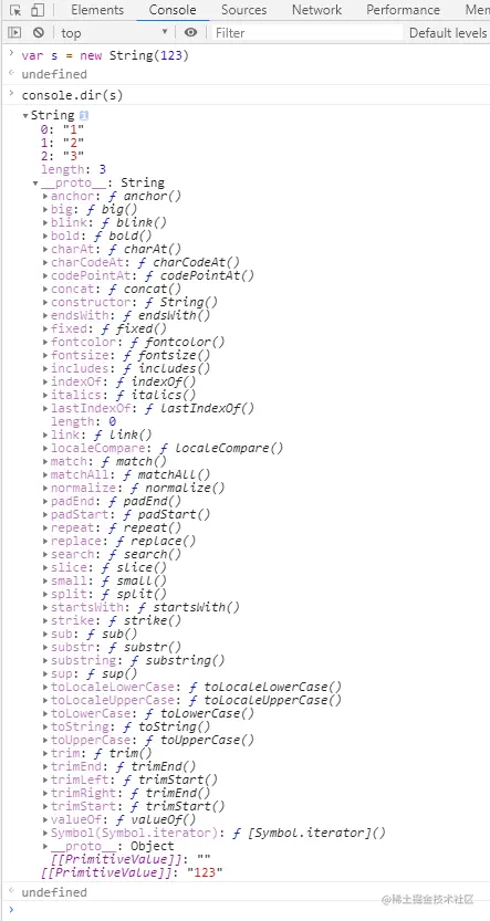 那么这个就更好理解了,因为什么?因为构造出string类型的包装类对象的构造函数的原型链上的方法多呗,有length和toString()。瞅瞅,这么多😒😒