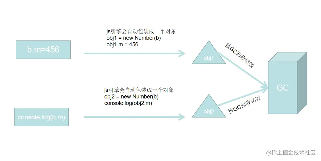 销毁了之后,再console.log(b.m);是又重新包装了一个新的对象,和增加属性时的根本不是同一个对象,当然返回的是undefined了,不得不说真会玩儿😢😢