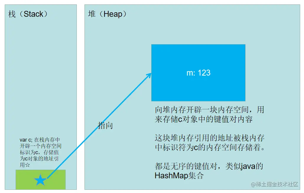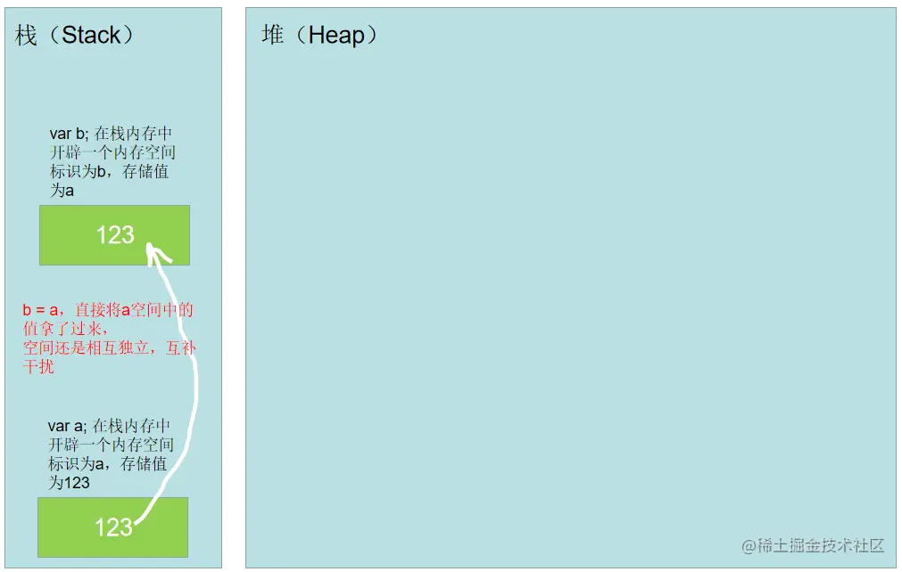 在内存中,原始值类型存储在栈(Stack)中,引用值类型则是将地址引用存储在栈里,内容值存储在堆(Heap)里。 内存这一块非常复杂,注意,任何事情都是有个目的所在的,比如老头子我之所以去研究底层原理,是因为这有助于自我技术的提高,可以让我能够在日常的开发或使用中更加灵活多变,但是老头我不是造内存的,所以也要懂得适可而止,只需要明白js的数据结构在内存中如何存储就ok,其他的有兴趣可以在深挖一下。😁😁