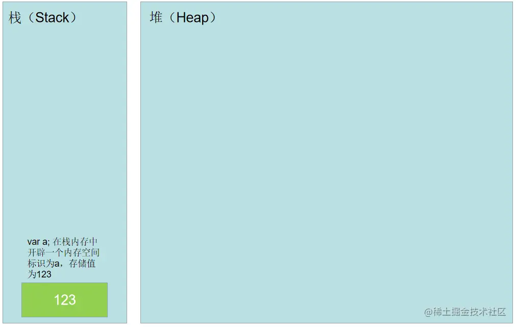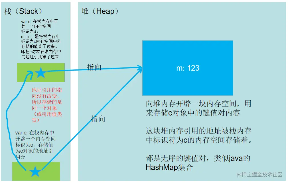 - 从底层角度出发,原始值类型存储在栈()中,引用值类型则是将地址引用存储在栈里,内容值存储在堆里。