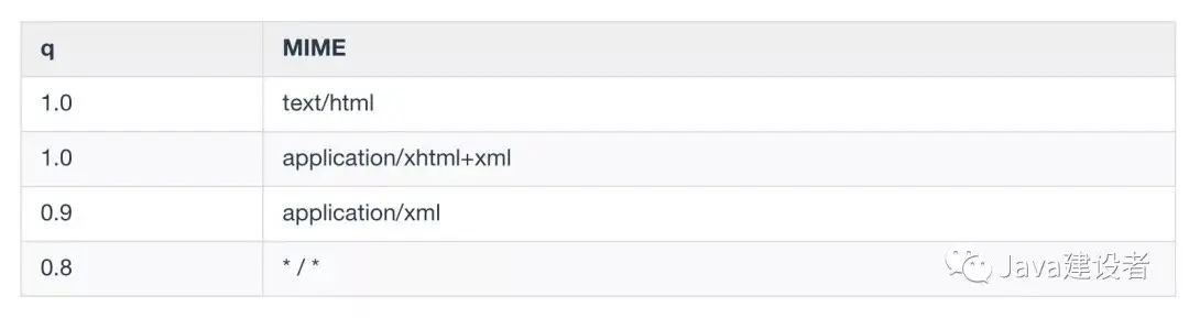 这是什么意思呢?若想要给显示的媒体类型增加优先级,则使用q=来额外表示权重值,没有显示权重的时候默认值是1.0 ,我给你列个表格你就明白了