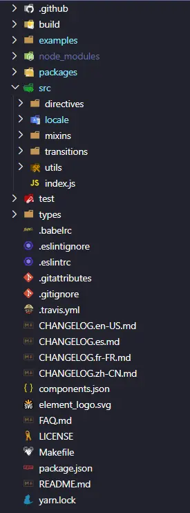 example文件夹存放的是一些示例代码src文件夹中存放的是一些指令工具方法packages文件夹中存放的是所有组件的封装源码packages/theme-chalk/src中存放的是所有样式相关文件types文件夹存放的是对于typescript的声明文件