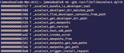 打印 libxcselect.dylib 的 name list 看看 _xcselect_invoke_xcrun这symbol 在不在这