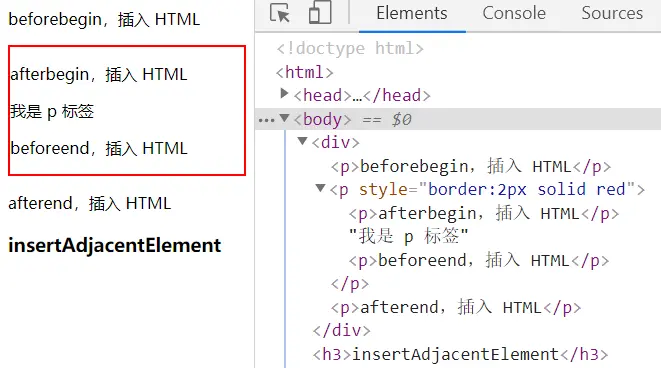 insertAdjacentElement()来说 ,参数可以是 元素引用。insertAdjacentText()是 文本字符串。<h3>insertAdjacentElement</h3> <div> <p style="border:2px solid red">我是 p 标签</p> </div> <script type="text/javascript"> let p = document.getElementsByTagName('p')[0]; let ht = `<p>beforebegin,插入 HTML</p>`; p.insertAdjacentHTML('beforebegin',ht); p.insertAdjacentHTML('afterend',`<p>afterend,插入 HTML</p>`); p.insertAdjacentHTML('afterbegin',`<p>afterbegin,插入 HTML</p>`); p.insertAdjacentHTML('beforeend',`<p>beforeend,插入 HTML</p>`); // insertAdjacentElement(), 第二个参数可以是元素引用或 HTML 字符串 // 这是一种在 DOM 中移动元素的简单方法 let d = document.querySelector('div'); let h = document.querySelector('h3'); d.insertAdjacentElement('afterend',h) </script>
