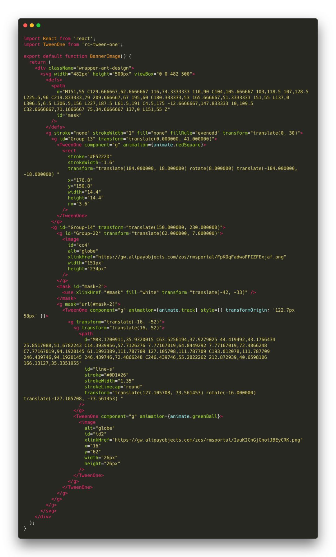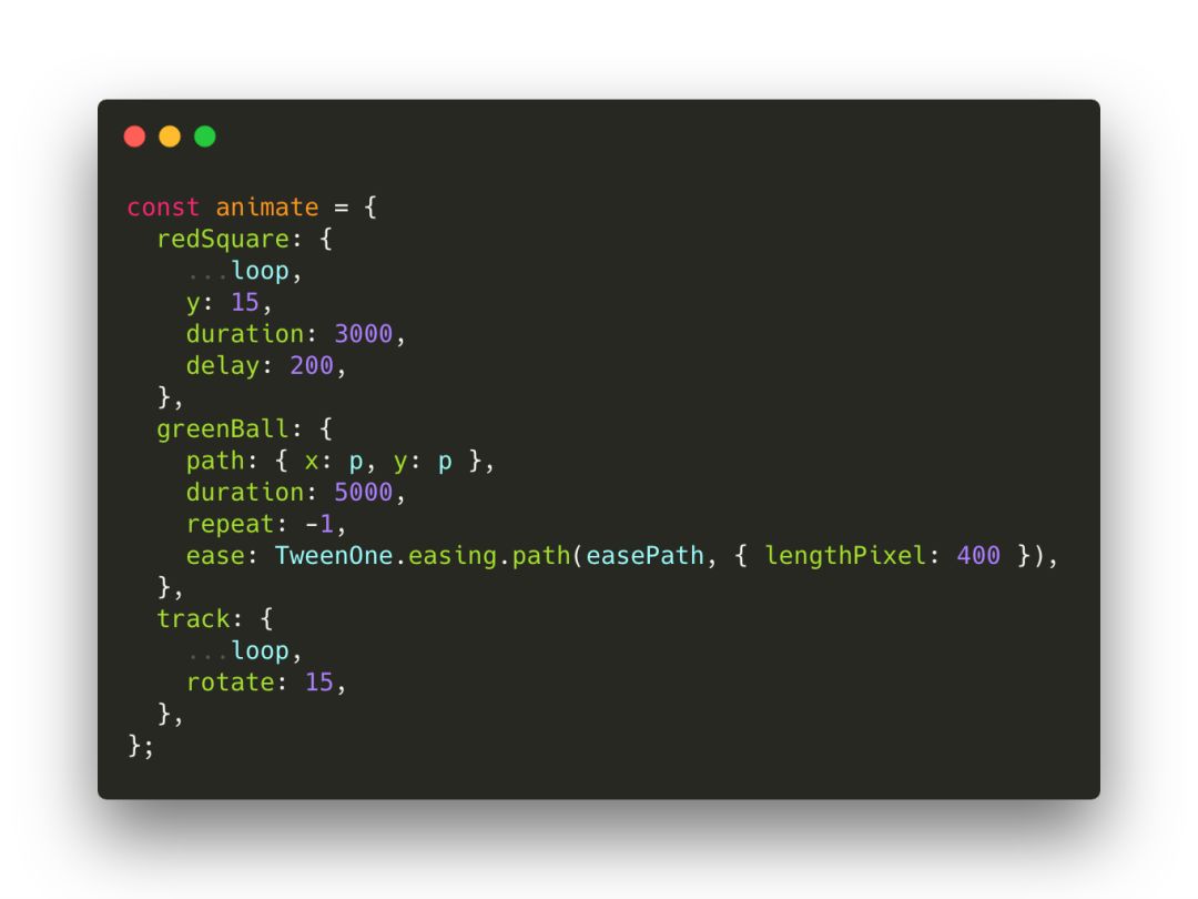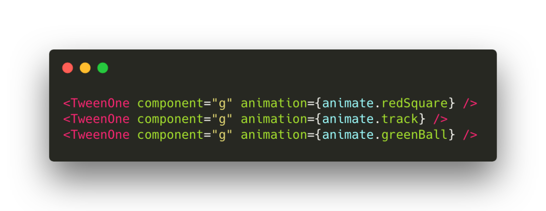 您无需担心此代码。 您必须注意TweenOne组件。让我们简短地提醒一下,这些组件将从 rc-tween-one 中导入。与基础属性和动画属性一起用作基本组件。这是我们的动画!每个TweenOne都有自己的动画规则,例如redSquare,track,greenBall。