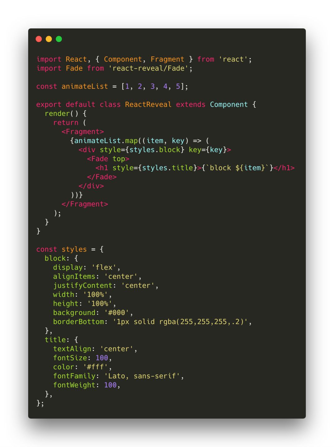 我们创建animateList常量。该数组包含5个元素。使用数组方法映射后,您可以呈现Fade组件中的每个元素,并将我们的项目插入标题。Const样式在我们的图块和标题中具有短的CSS样式。顶部有5个带有Fade动画的方块。