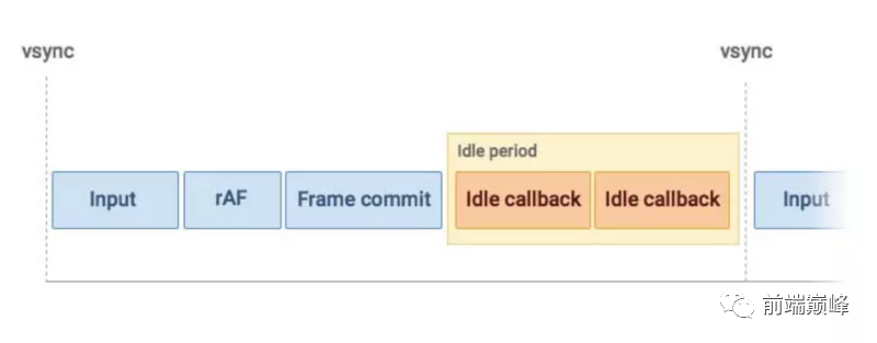 假如某一帧里面要执行的任务不多,在不到16ms(1000/60)的时间内就完成了上述任务的话,那么这一帧就会有一定的空闲时间,这段时间就恰好可以用来执行requestIdleCallback的回调,如下图所示:
