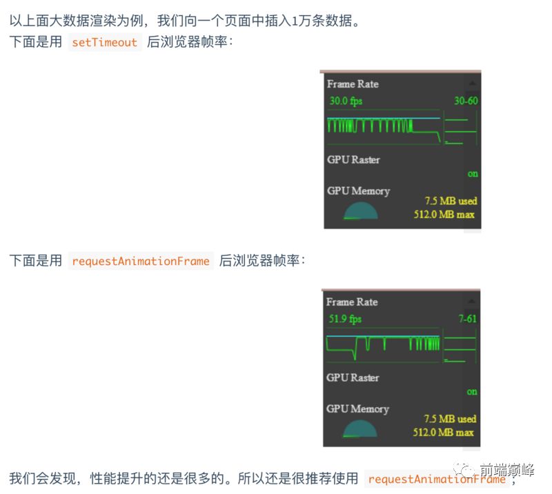 第一个就是动画的循时间环间隔不好确定,设置长了动画显得不够平滑流畅,设置短了浏览器的重绘频率会达到瓶颈,推荐的最佳循环间隔是17ms(大多数电脑的显示器刷新频率是60Hz,1000ms/60);第二个问题是定时器第二个时间参数只是指定了多久后将动画任务添加到浏览器的UI线程队列中,如果UI线程处于忙碌状态,那么动画不会立刻执行。为了解决这些问题,H5 中加入了 requestAnimationFrame以及requestIdleCallbackrequestAnimationFrame 会把每一帧中的所有 DOM 操作集中起来,在一次重绘或回流中就完成,并且重绘或回流的时间间隔紧紧跟随浏览器的刷新频率在隐藏或不可见的元素中,requestAnimationFrame 将不会进行重绘或回流,这当然就意味着更少的 CPU、GPU 和内存使用量requestAnimationFrame 是由浏览器专门为动画提供的 API,在运行时浏览器会自动优化方法的调用,并且如果页面不是激活状态下的话,动画会自动暂停,有效节省了 CPU 开销