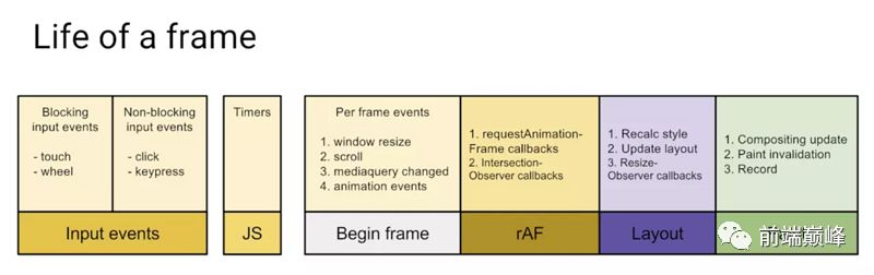 图中一帧包含了用户的交互、js的执行、以及requestAnimationFrame的调用,布局计算以及页面的重绘等工作。