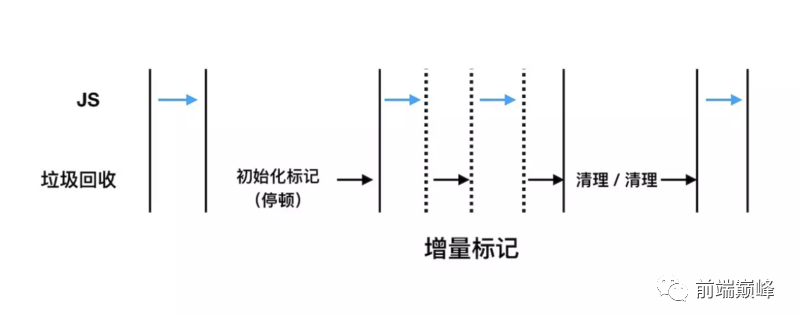 为了降低全部老生代全堆垃圾回收带来的停顿时间,V8 将标记过程分为一个个的子标记过程,同时让垃圾回收标记和JS应用逻辑交替进行,直到标记阶段完成。