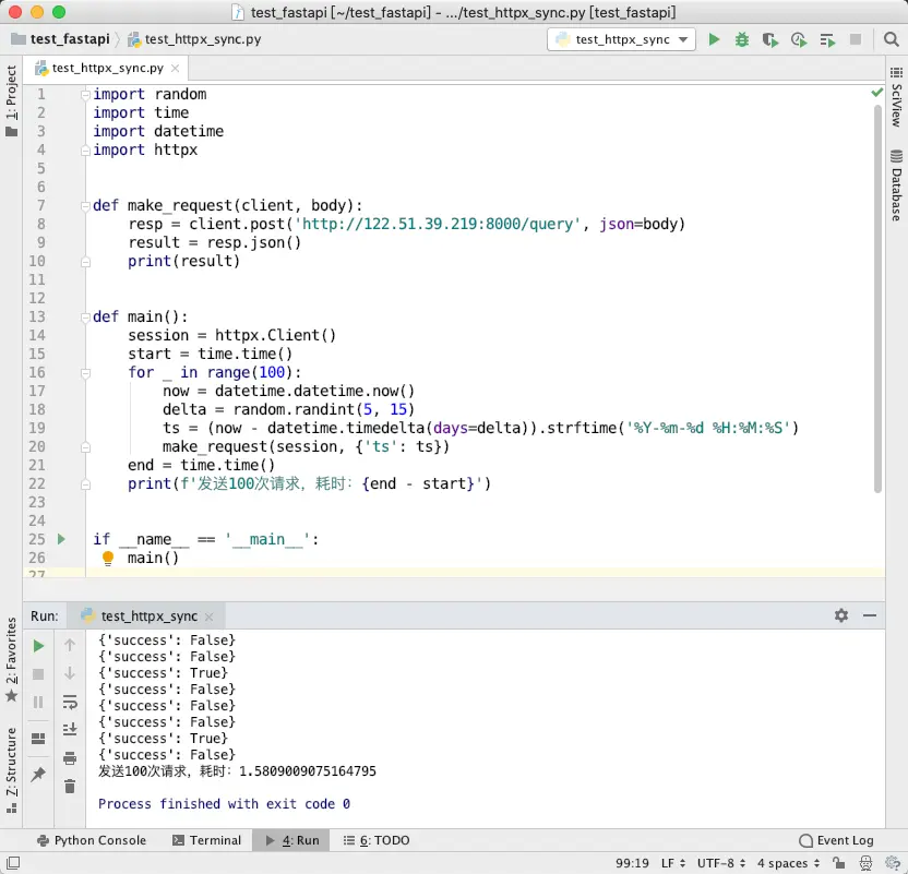 发送100次请求,httpx 同步模式耗时1.5秒左右。