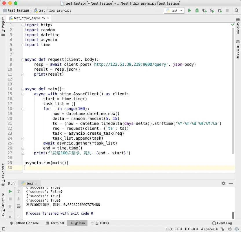 发送100次请求,httpx 异步模式耗时0.6秒左右。