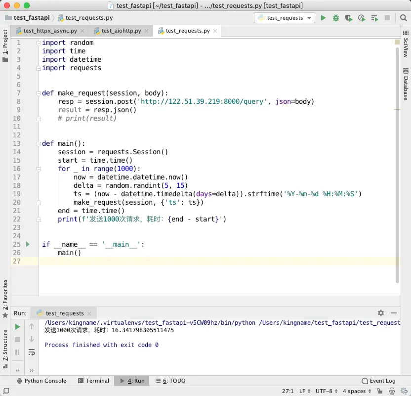 由于 request 保持连接的速度比不保持连接快,所以我们这里只用保持连接的方式来测试。并且不打印返回的结果。