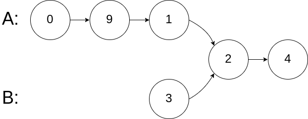 输入解释:相交节点的值为 2 (注意,如果两个列表相交则不能为 0)。从各自的表头开始算起,链表 A 为 [0,9,1,2,4],链表 B 为 [3,2,4]。在 A 中,相交节点前有 3 个节点;在 B 中,相交节点前有 1 个节点。
