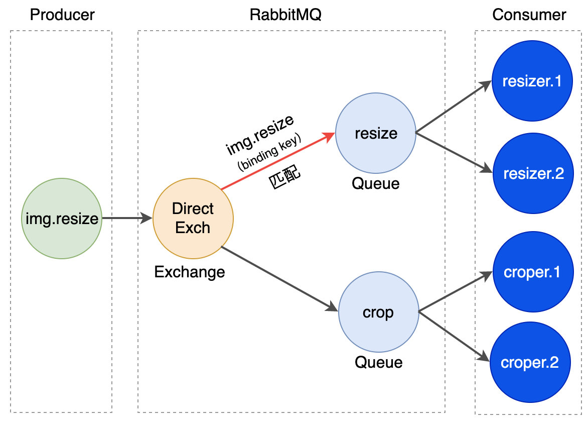 生产者(绿色球)发送了一个消息,带着一个 routing key -- img.resize。