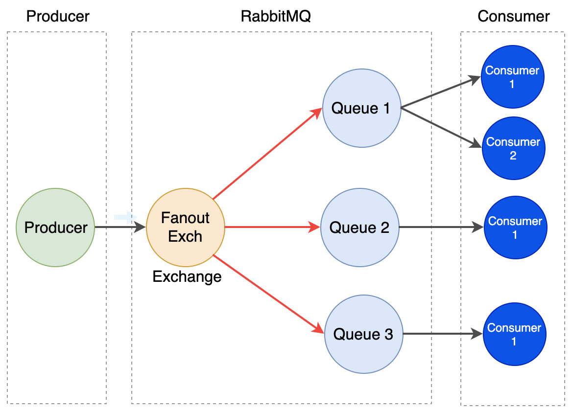 注意,此方式是 exchange 广播给 queue,不是 queue 广播给 consumer。queue 到 consumer 还是轮询的方式。
