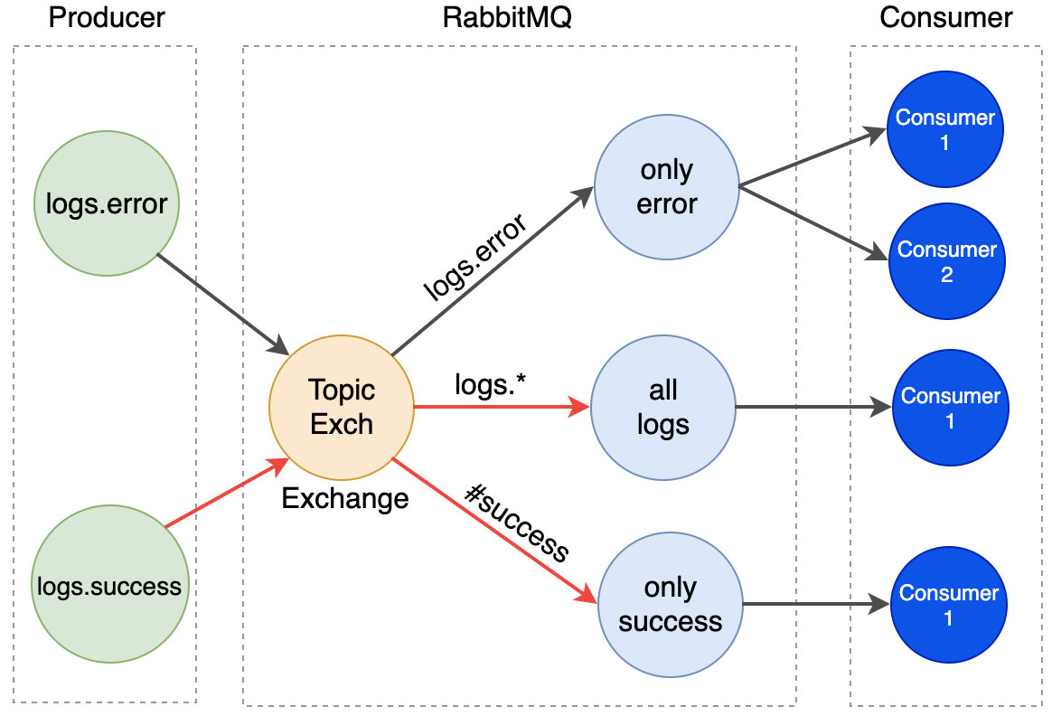 routing key 为 logs.success 的消息,匹配binding key -- #success 和 logs.*,所以消息会进入 "only success" 和 "alllogs"。